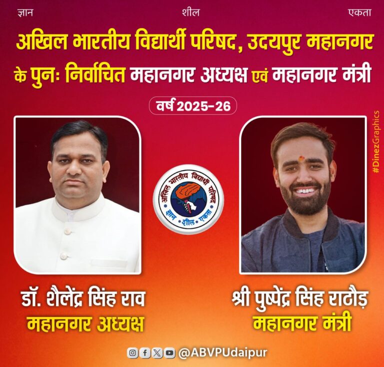 अखिल भारतीय विद्यार्थी परिषद (ABVP) उदयपुर महानगर के सत्र 2025-26 के लिए डॉ. शैलेन्द्र सिंह राव को पुनः महानगर अध्यक्ष...