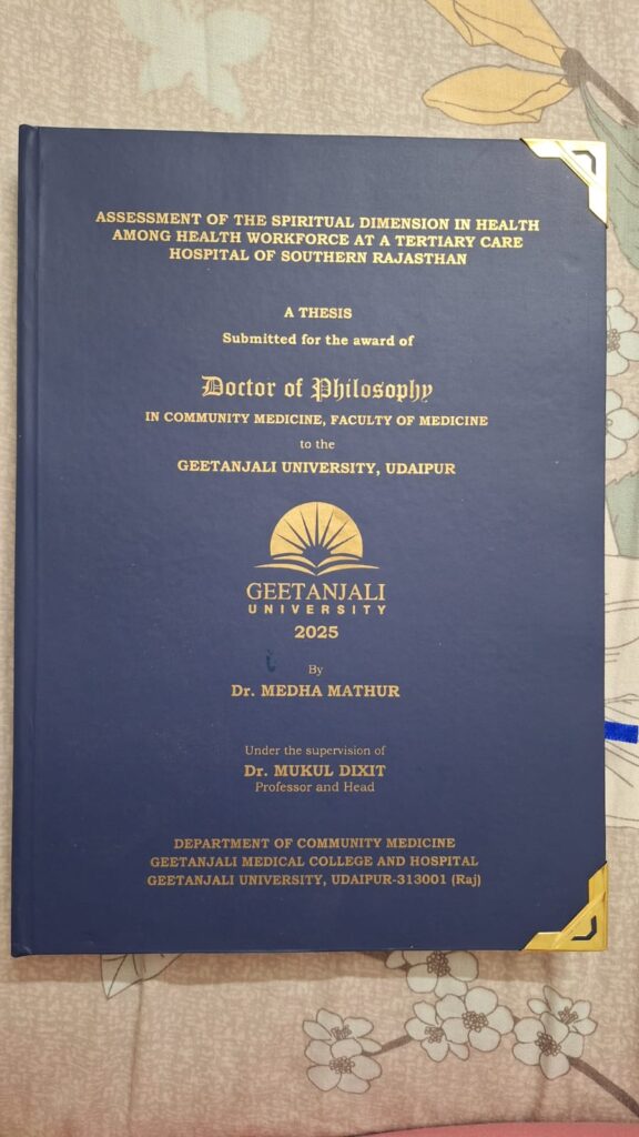 उन्होंने डॉ. मुकुल दीक्षित, प्रोफेसर एवं हेड, कम्युनिटी मेडिसिन विभाग, गीतांजलि मेडिकल कॉलेज एवं हॉस्पिटल के कुशल मार्गदर्शन में “ असेसमेंट ऑफ़ द स्पिरिचुअल डायमेंशन इन हेल्थ अमंग हेल्थ वर्कफोर्स एट ए टरशियरी केयर हॉस्पिटल ऑफ़ सदर्न राजस्थान’ शीर्षक विषय पर अपना शोध कार्य किया