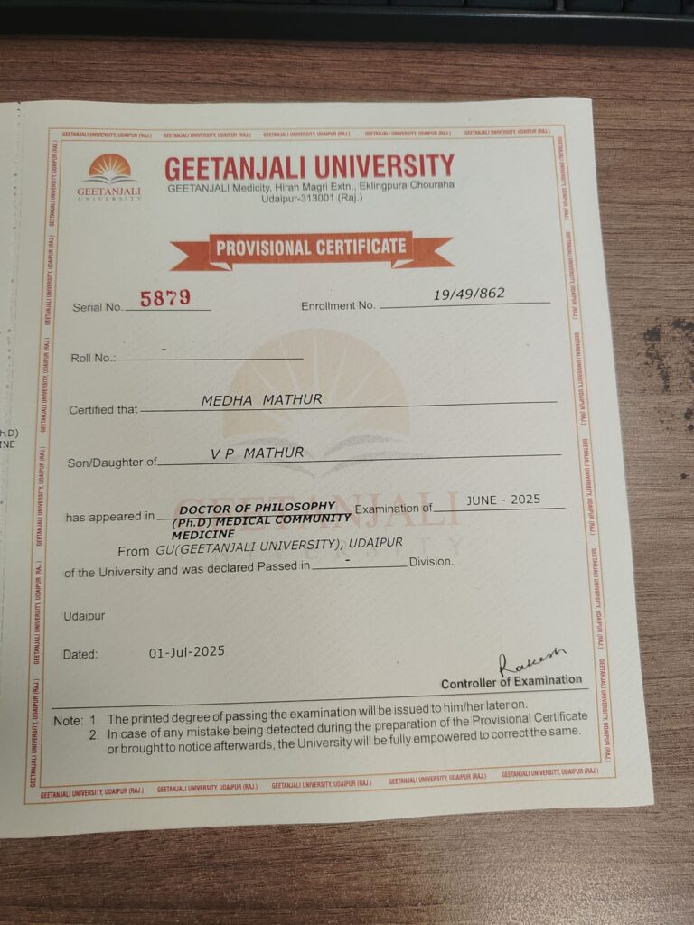 गीतांजलि मेडिकल कॉलेज एवं हॉस्पिटल के कम्युनिटी मेडिसिन विभाग की प्रोफेसर डॉ. मेधा माथुर को गीतांजलि विश्वविद्यालय, उदयपुर द्वारा डॉक्टर ऑफ फिलॉसफी (पी.एच.डी.) की उपाधि प्रदान की गई है।