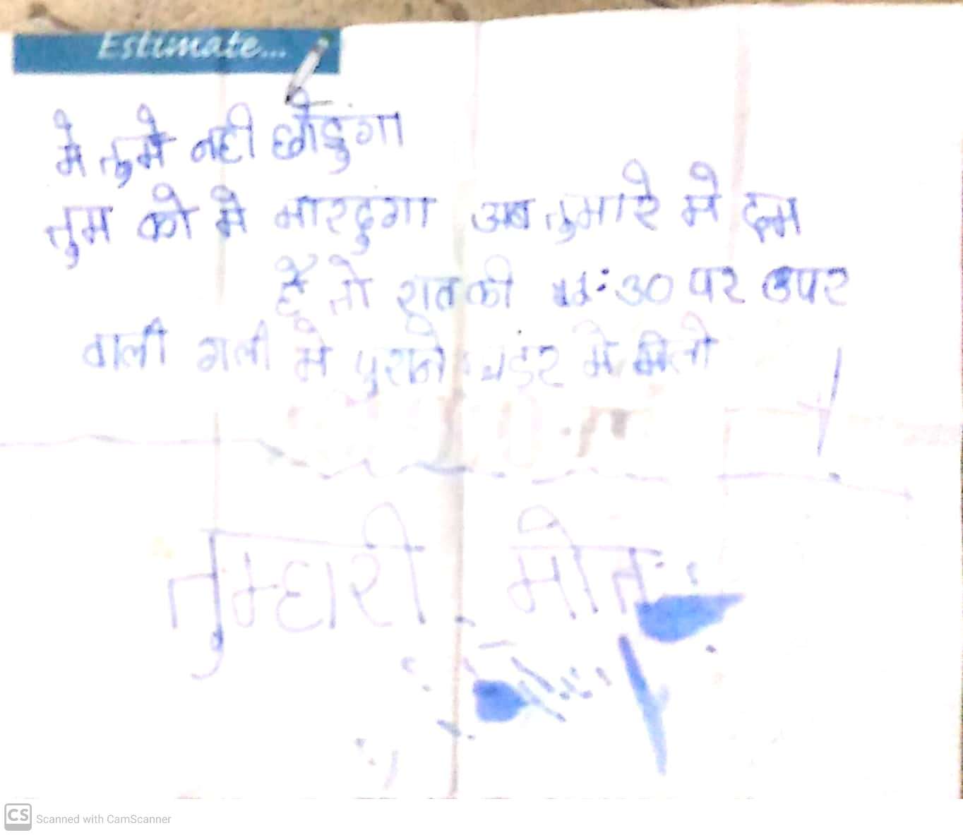 जिस पर लिखा था ” मैं तुम्हें नहीं छोडूंगा, तुमको मैं मार दूंगा अब तुम्हारे में दम है तो रात की 11:30 पर ऊपर वाली गली में पुराने खंडहर में मिलो, तुम्हारी मौत। इस तरह का धमकी भरा लेटर मिलने से क्षेत्र में दशहत फैल गई। इस घटना के दौरान पुलिस के जवान गश्त करते हुए निकले तो क्षेत्र वासियों ने धमकी भरे लेटर की जानकारी पुलिस को दी।